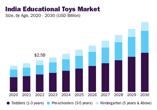 This report states that the Indian educational toys market was worth $2.83 billion in 2023 and is expected to grow at a CAGR of 14% from 2024 to 2030. The report also notes that educational toys for toddlers accounted for 54% of the market in 2023.