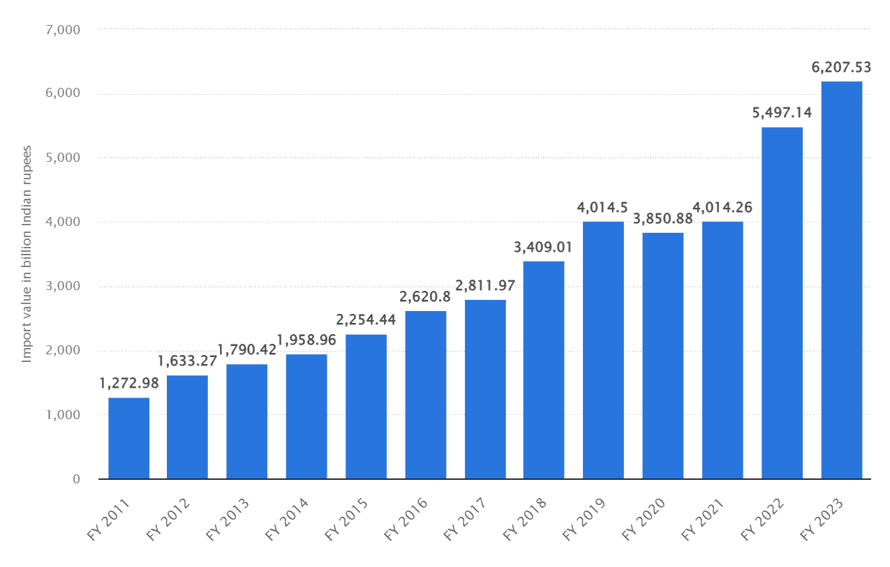 Electrical equipment and machinery are among India's major imports on a regular basis. Imports of these commodities are driven by the need for innovative technology in industries such as consumer electronics, manufacturing, and telecommunications. India from a number of nations; the US, China, Germany, Japan, and South Korea are among the main providers.