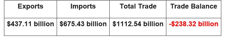 | Rank | Country | Exports | Imports | Total Trade | Trade Balance |